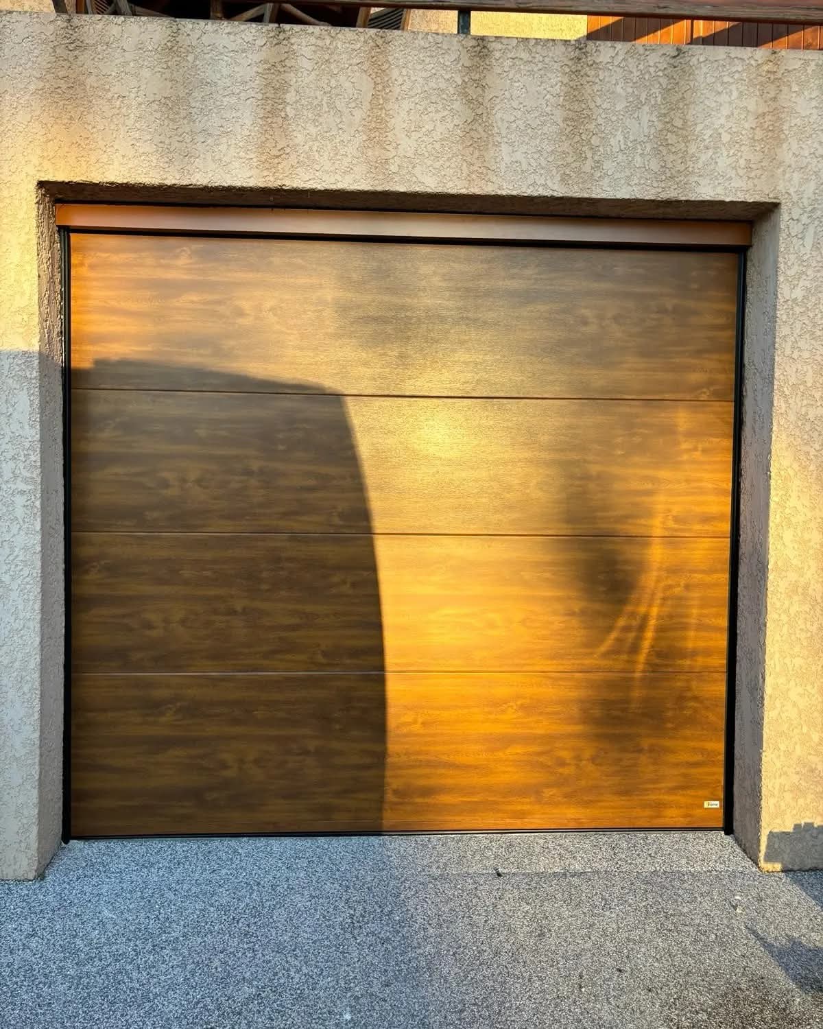 Pour compléter le projet, une porte de garage sectionnelle en acier imitation bois a été installée. Ce choix garantit :